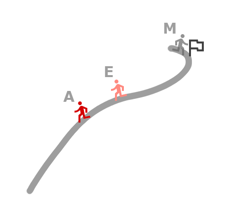 Implementation-wise the logic is rather simple, at the beginning of the simulation we set E to the start line and initialize our predictor’s state, supplying the track’s shape (for moving E on the right path) as well as setting some initial pace that we think the runner will keep. As mentioned, for the demo we can set it to an intentionally low value to see its effect on the A-E difference.