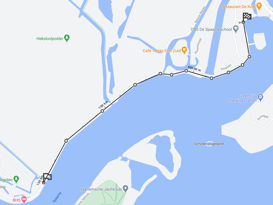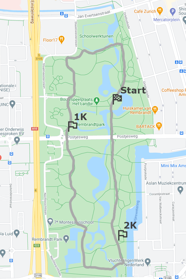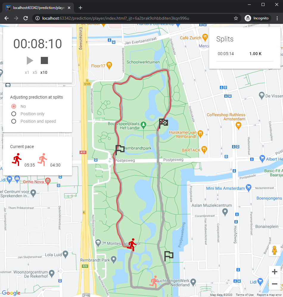To have a race track for testing purposes, I have recorded a loop in Rembrandtpark, Amsterdam, a place where I used to go for runs myself. Coming from my phone’s GPS receiver, the path is not extremely accurate, however, for the purpose of this exercise the recorded coordinate series is sufficient to serve as the race track that the imaginary runner of the simulation must progress through. I also marked a few split locations, where the race timing equipment would be placed in case of a real race. These are the 1K, 2K markers and the start/finish line at 2.66K. For implementing the prediction logic we do not need actual equipment placed in the park though, we will just assume that the performance of the runners will be measured at these locations.